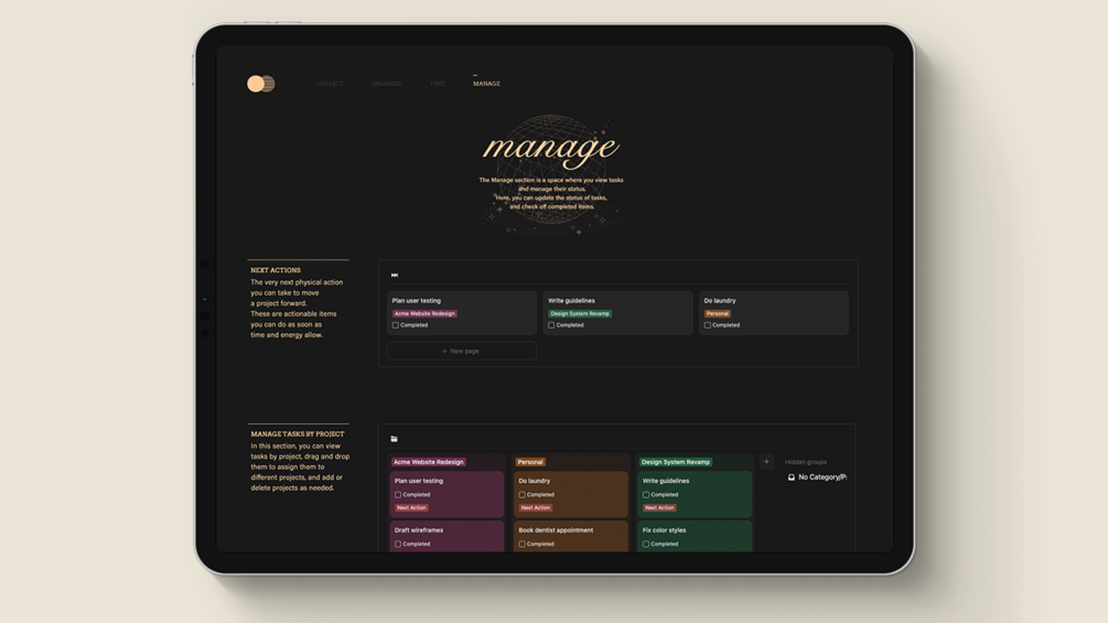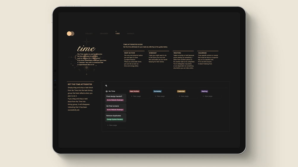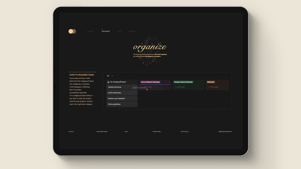 It’s a minimalist productivity system — where focus meets function, and every step is designed to reduce friction and drive momentum.