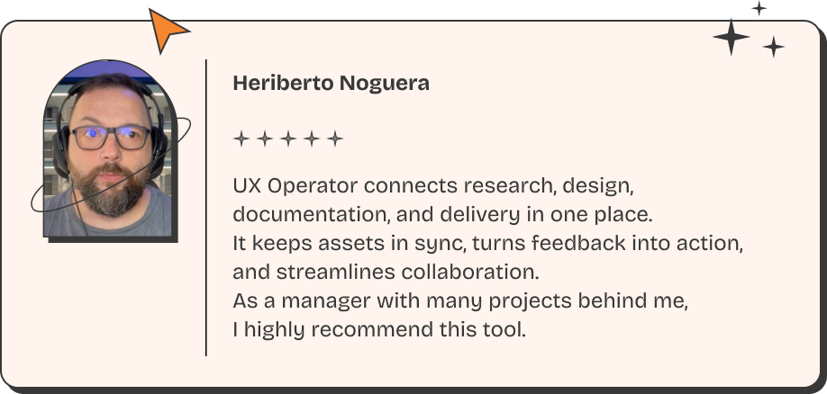 If you tried to design and build a complete UX management system yourself, you’d spend countless hours. UX Operator saves you all that time by giving you a ready-to-use, field-tested system.