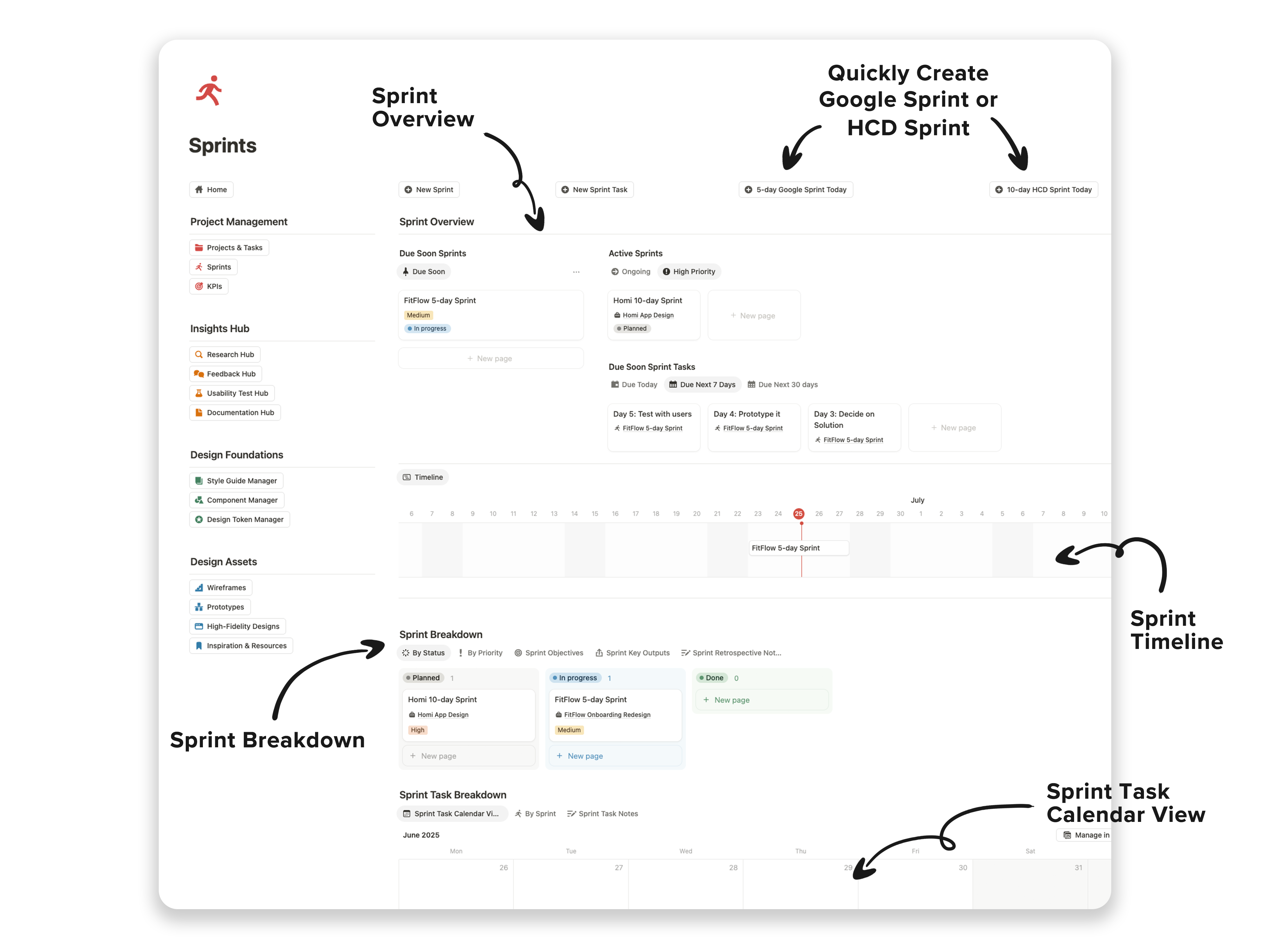 Create Google or HCD Sprints in one click, view the full timeline, and manage sprint tasks on a calendar.